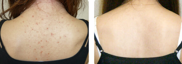 昔からずっと背中にニキビができやすく、その跡が残って色素沈着のように黒ずんでいました。ジュエルレインを使い出してからニキビはあっという間にキレイになったのですが、まだ色素沈着に変化はない様子です。でも、全体的に黒ずみが取れて肌に透明感が出てきた気がします。もう少し使い続けてみて様子をみようと思います。