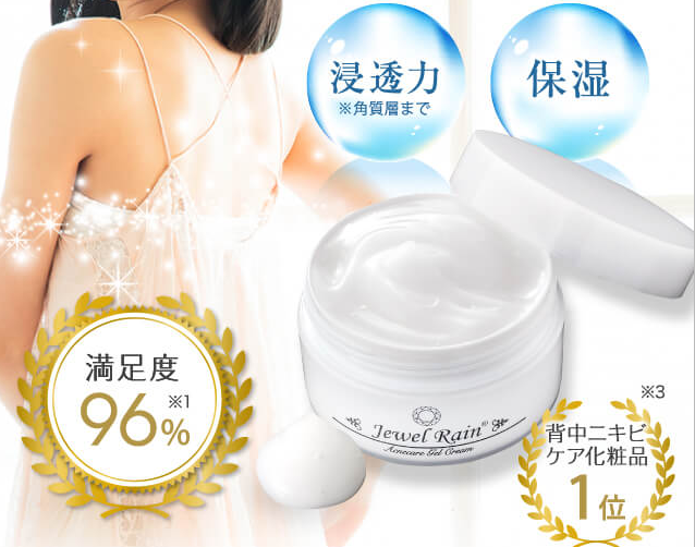 何度もできてな治るを繰り返して人に見せるのも恥ずかしかった背中でしたが、ジュエルレインがそんな私を救ってくれました。かなり伸びがいいので1回の使用量も少量でよくコスパもよくてうれしいです。ジュエルレインを使い始めてから背中がつるつるになって、ニキビや吹き出物もできににくくなったと思います。